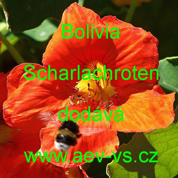 Popis: Lichořeřišnice větší (Tropaeolum majus) Bolivia Scharlachroten šarlatově červená je asi 25 centimetrů vysoká jednoletka. Je to výborná léčivá rostlina, pomáhá při zánětech horních cest dýchacích, chronických zánětech plic a také při akutních a chronických zánětech močových cest vyvolaných infekcí. Neškodí střevním bakteriím ani je nepotlačuje, nepoškozuje ledviny. Pravidelné užívání zřetelně zvyšuje odolnost proti katarům horních cest dýchacích a dalším infekčním nemocem, zvyšuje chuť k jídlu a podporuje trávení.