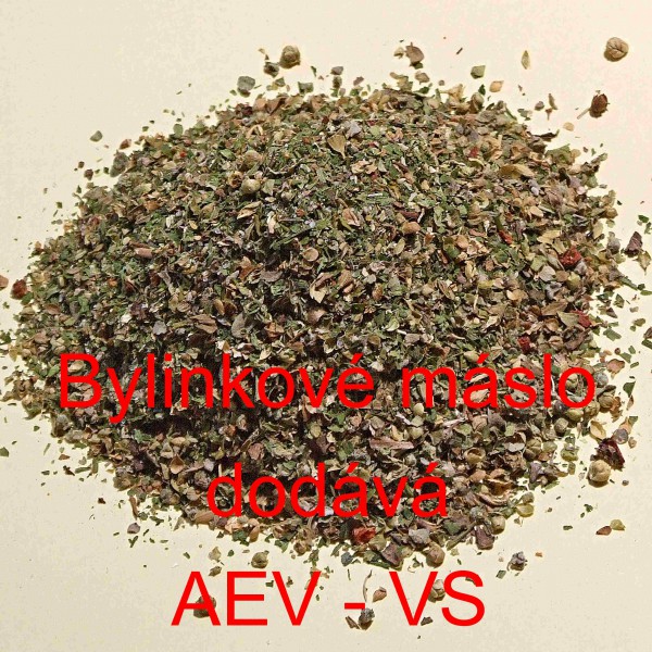 Popis: Bylinkové máslo, obsahuje: asi 26% jedlé kuchyňské soli, oregano, majoránku, petržel, pažitku, česnek, papriku, cukr