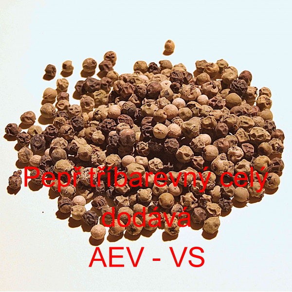 Pepř tříbarevný celý je směs bílého, černého a zeleného pepře.