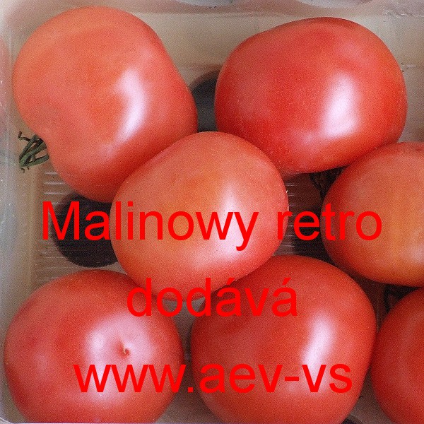 Popis: Rajče tyčkové (Lycopersicon esculentum Mill.) Malinowy retro je rané růžově červené (malinově červené) asi 85 gramové kulovité tyčkové rajče pod fólie i na záhon. Je nejenom barevně zajímavé, ale i chutné a výnosné. Není náchylné k praskání. V příznivém roce lze z jedné rostliny sklidit asi 6 až 8 kilogramů šťavnatých neobvyklých malinově červených plodů.