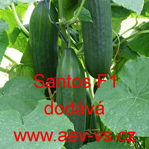Popis: Okurka setá salátová (Cucumis sativus L.) Santos F1 je zelená asi 32 až 35 centimetrů dlouhá hybridní partenokarpická salátová okurka setá "hadovka" do skleníku. Odolává nepřízni počasí.