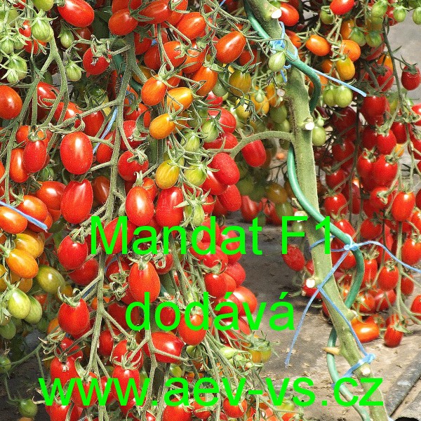 Rajče tyčkové (Lycopersicon esculentum Mill.) Mandat F1 je rané velice úrodné super sladké červené oválné "datlové" asi 10 až 15 gramové hybridní tyčkové rajče. Během růstu vytváří dlouhé vijany doslova "obalené" asi 20 až 25 pevnými nepraskavými a předčasně neopadávajícími plody. Hodí se na záhon, do skleníku, fóliovníku, do velkého květináče, truhlíku a okrasného koryta na balkony a lodžie.