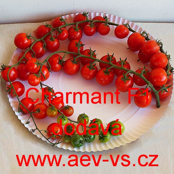 Rajče tyčkové (Solanum lycopersicum L.) Charmant F1 je polorané sladké chorobám odolné pevné LSL asi 15 gramové červené třešňové tyčkové hybridní rajče. Vytváří dlouhé vijany plodů. Hodí se do skleníku, fóliovníku, na prosluněný záhon i do velkého květináče na balkon nebo terasu.