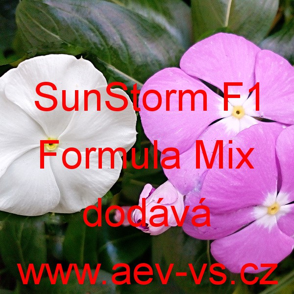 Barvínek růžový, katarantus, vinca (Catharanthus roseus) SunStorm F1 Formula Mix je pestrobarevná nízká až převislá směs jednoletých květin. Hodí se na záhon, do truhlíku, květináče, okrasného koryta i závěsných nádob.