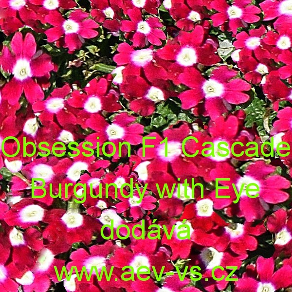 Sporýš zahradní, zkřížený (Verbena hybrida) Obsession F1 Cascade Burgundy with Eye je velice dekorativní nízká, převislá bohatě kvetoucí vínově červená jednoletá květina s bílým okem.