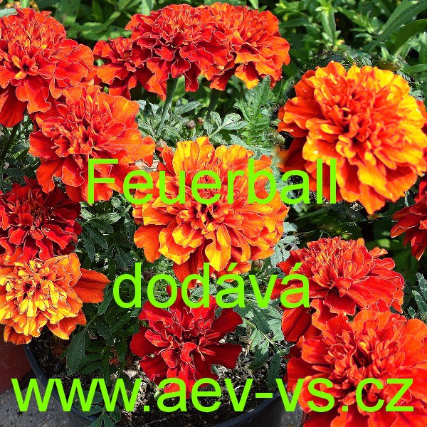 Aksamitník rozkladitý (Tagetes patula) Feuerball je nízká plnokvětá jednoletá vícebarevná květina. Je to zcela nový typ aksamitníku, který vykvétá v průměru až 6 centimetrovými květy. Na jednom stonku vytváří záplavu květů různě barevných odstínů, od sytě žlutých přes oranžové až po červené. Je vynikající do květináče, truhlíku, okrasných nádob i na záhony.