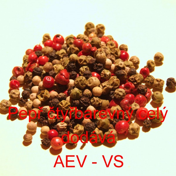 Pepř čtyřbarevný celý je směs bílého, černého, červeného (růžového) a zeleného pepře.