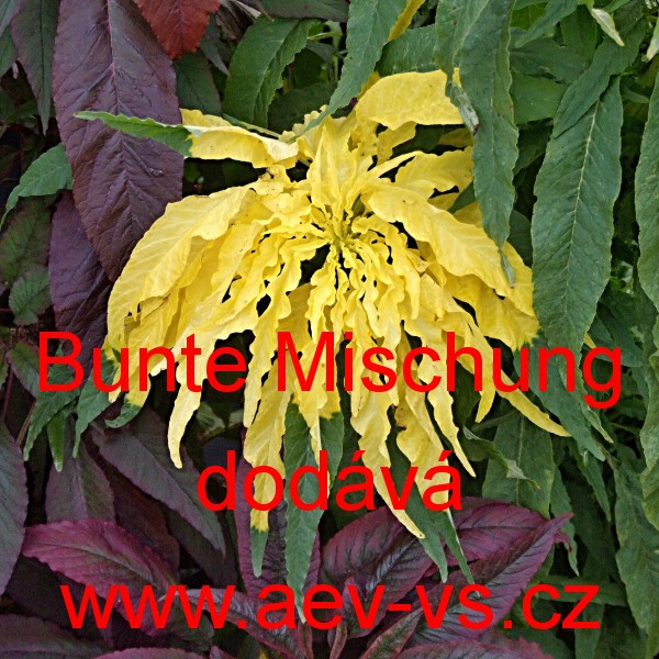 Popis: Laskavec trojbarvý (Amaranthus tricolor) Bunte Mischung je až 120 centimetrů vysoká směs jednoletých květin. Pěstuje se hlavně na barevné listy. Hodí se i na sušení, do suchých vazeb.