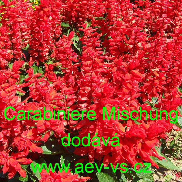 Popis: Šalvěj zářivá (Salvia splendens) Carabiniere Mischung je asi 40 centimetrů vysoká červená jednoletá květina. Hodí se na záhon, do truhlíku, květináče a okrasného koryta.