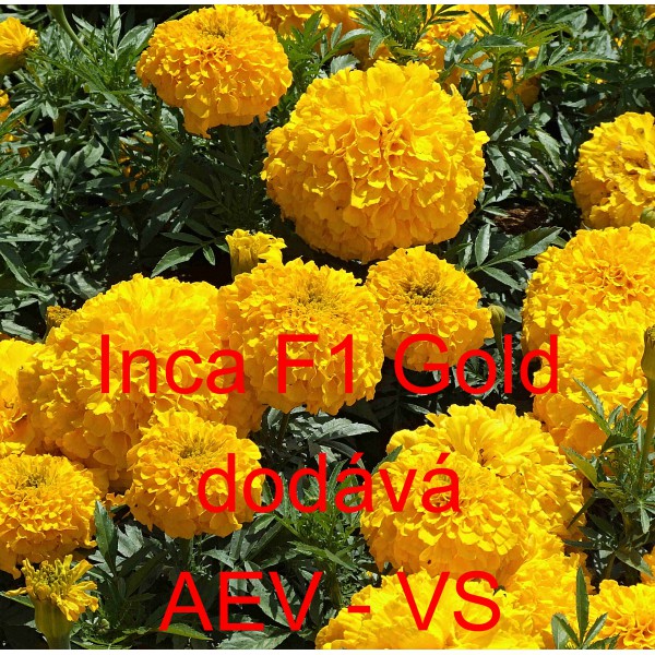 Aksamitník vzpřímený (Tagetes erecta) Inca F1 Gold je nízká zlatožlutá plnokvětá velkokvětá (kulatokvětá) jednoletá květina.
