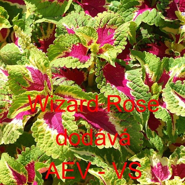 Popis: Africká kopřiva, Pochvatec ozdobný, šišákovitý, Kopřivěnka zkřížená (Coleus blumei) Wizard Rose je asi 30 centimetrů vysoká jednoletá květina. Vytváří okrasné růžové, krémově ohraničené listy se zeleným okrajem. Hodí se na záhon, do truhlíku, květináče a okrasného koryta.