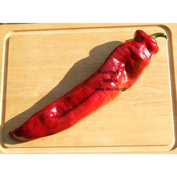 Popis: Paprika roční zeleninová (Capsicum annuum) Palermo F1 (typ Sweet Italien Dulce, SweetPalermo) je výborná velice výnosná italská příjemně sladká asi 120 až 150 gramů těžká dlouhá sytě červená kónická hybridní zeleninová paprika roční, typ kapia. Odolává chladu a chorobám paprik. Pěstovat ji můžeme ve skleníku, fóliovníku i na prosluněném záhonu.