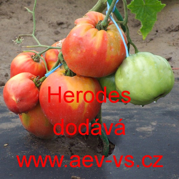 Popis: Rajče tyčkové (Solanum lycopersicum L.) Herodes je polorané pevné červené masité až asi 250 gramové tyčkové rajče, typ býčí srdce do fóliovníku i na záhon. Hodí se i na grilování a rožnění.