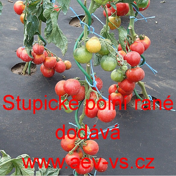 Rajče tyčkové (Lycopersicon esculentum L.) Stupické polní rané je velmi rané jasně červené asi 55 gramové kulaté tyčkové rajče pod fólie i na záhon.