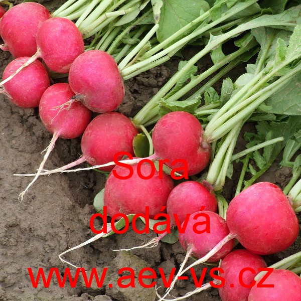 Popis: Ředkvička (Raphanus sativus var. sativus) Sora je červená kulovitá letní ředkvička na záhon.