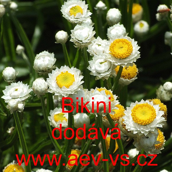 Popis: Slaměnka křídlatá, pískožil křídlatý (Ammobium alatum) Bikini je asi 30 centimetrů vysoká košatá bílá jednoletá květina se žlutým středem. Hodí se i na sušení, do suchých vazeb. Semena se dodávají ve výběrové kvalitě Professional Seeds.