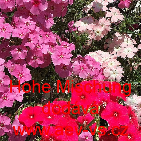 Popis: Plamenka Drummondova, flox letní (Phlox drummondii) Hohe Mischung je asi 50 centimetrů vysoká směs jednoletých květin. Hodí se na záhon, do truhlíku, květináče a okrasného koryta.