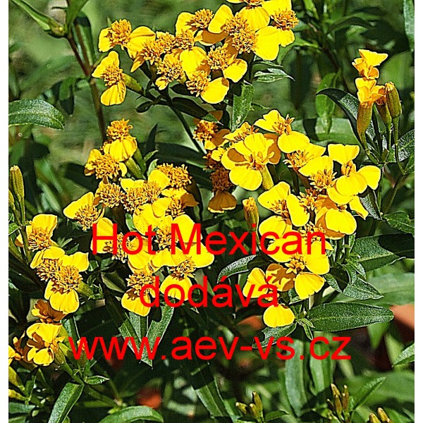 Popis: Aksamitník lesklý (Tagetes lucida) Hot Mexican je asi 40 centimetrů vysoká žlutá jednoletá květina. Hodí se na záhon, do truhlíku, květináče, závěsných nádob a okrasného koryta.