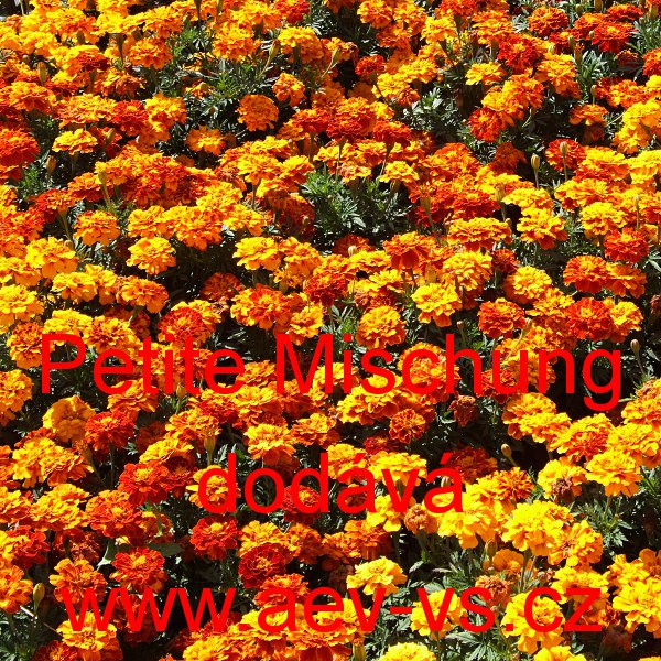 Popis: Aksamitník rozkladitý (Tagetes patula) Petite Mischung je asi 20 centimetrů vysoká směs plnokvětých jednoletých květin. Hodí se na záhon, do truhlíku, květináče a okrasného koryta.
