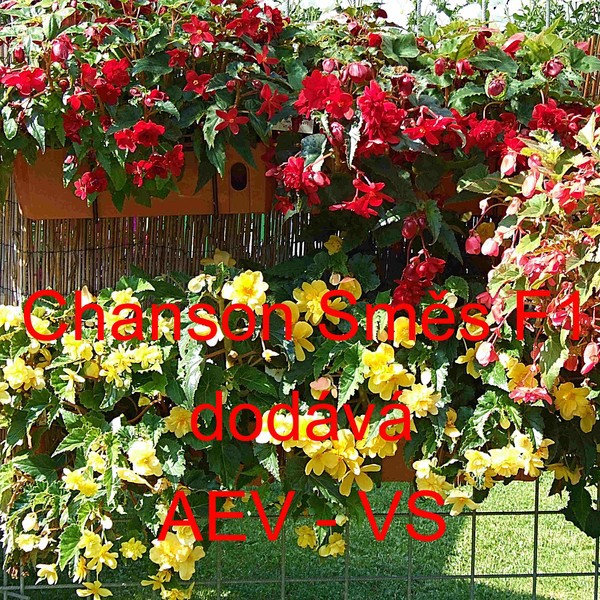 Kysala velkokvětá, hlíznatá, převislá (Begonia tuberhybrida pendula) Chanson F1 Mix je směs nízkých jednoletých květin. Vytváří až 50 centimetrů dlouhé kvetoucí převisy.