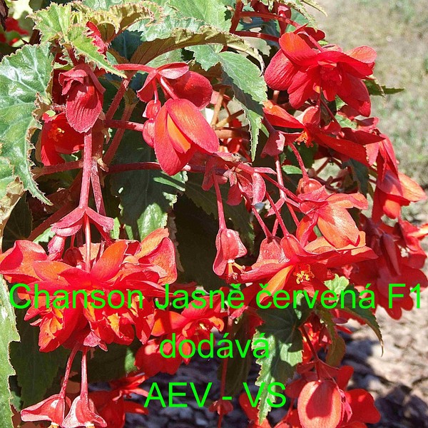 Kysala velkokvětá, hlíznatá, převislá (Begonia tuberhybrida pendula) Chanson Jasně červená F1 je nízká jednoletá květina. Vytváří až 50 centimetrů dlouhé kvetoucí převisy.